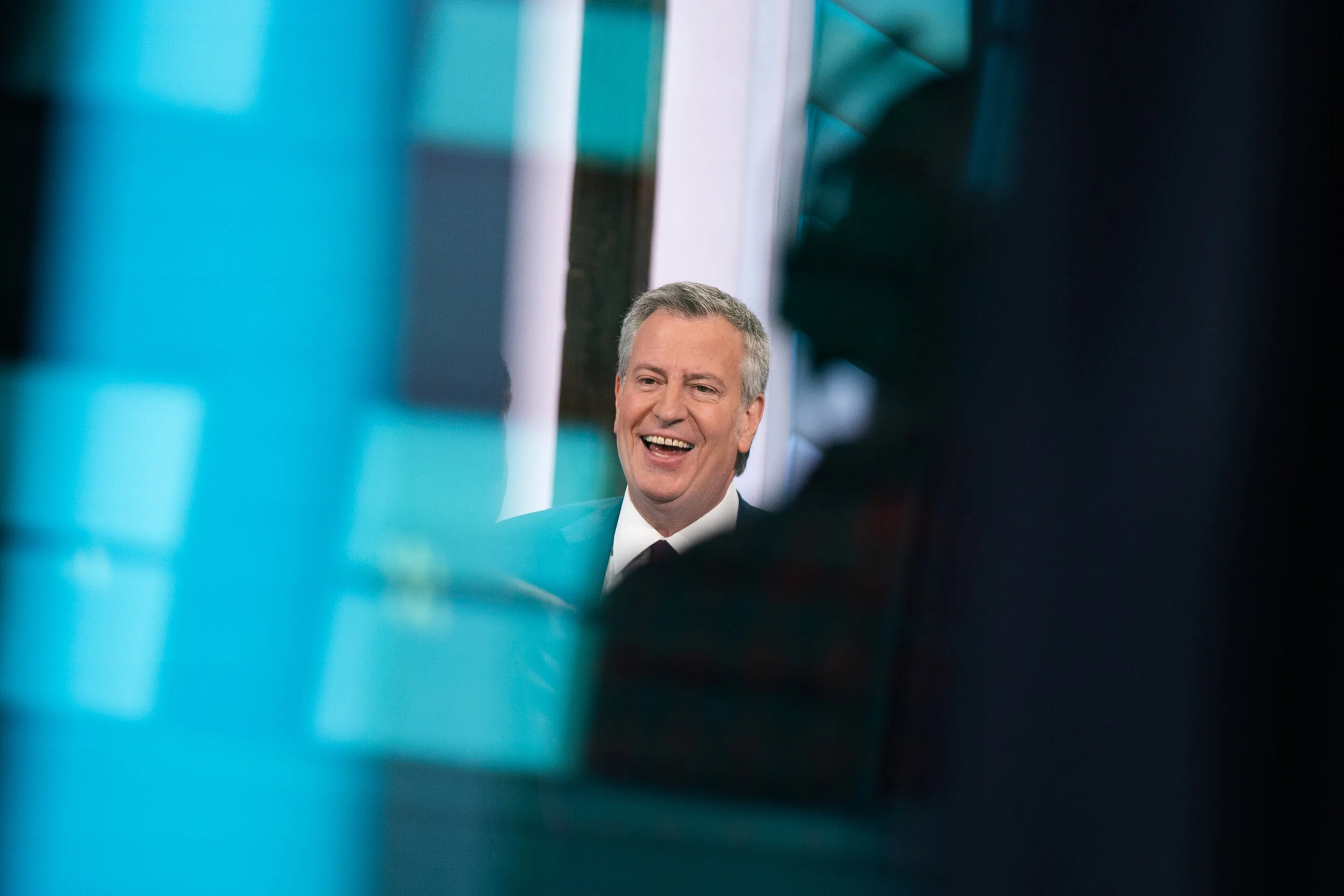 A middle-aged man in a dark suit, white shirt, and glasses stands by a large window with a cityscape view in the background. View fullsize