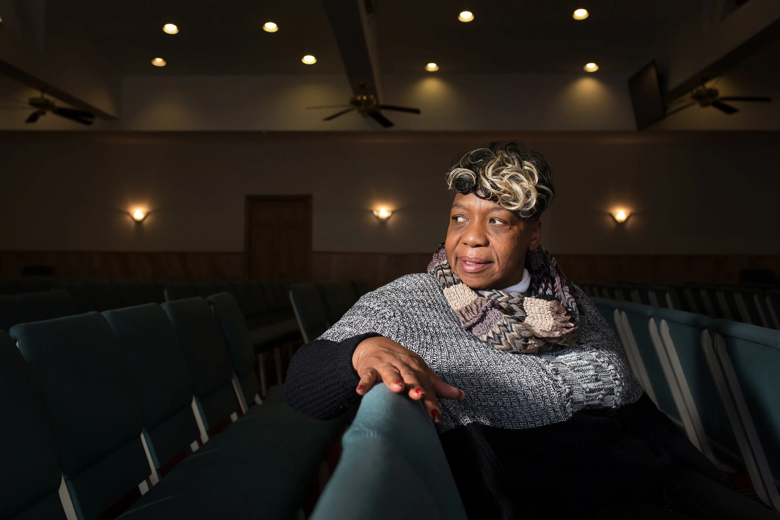 Black and white photo of an elderly man in a suit with a flag pin on his lapel, sitting in an office chair, looking at the camera with a slight smile.