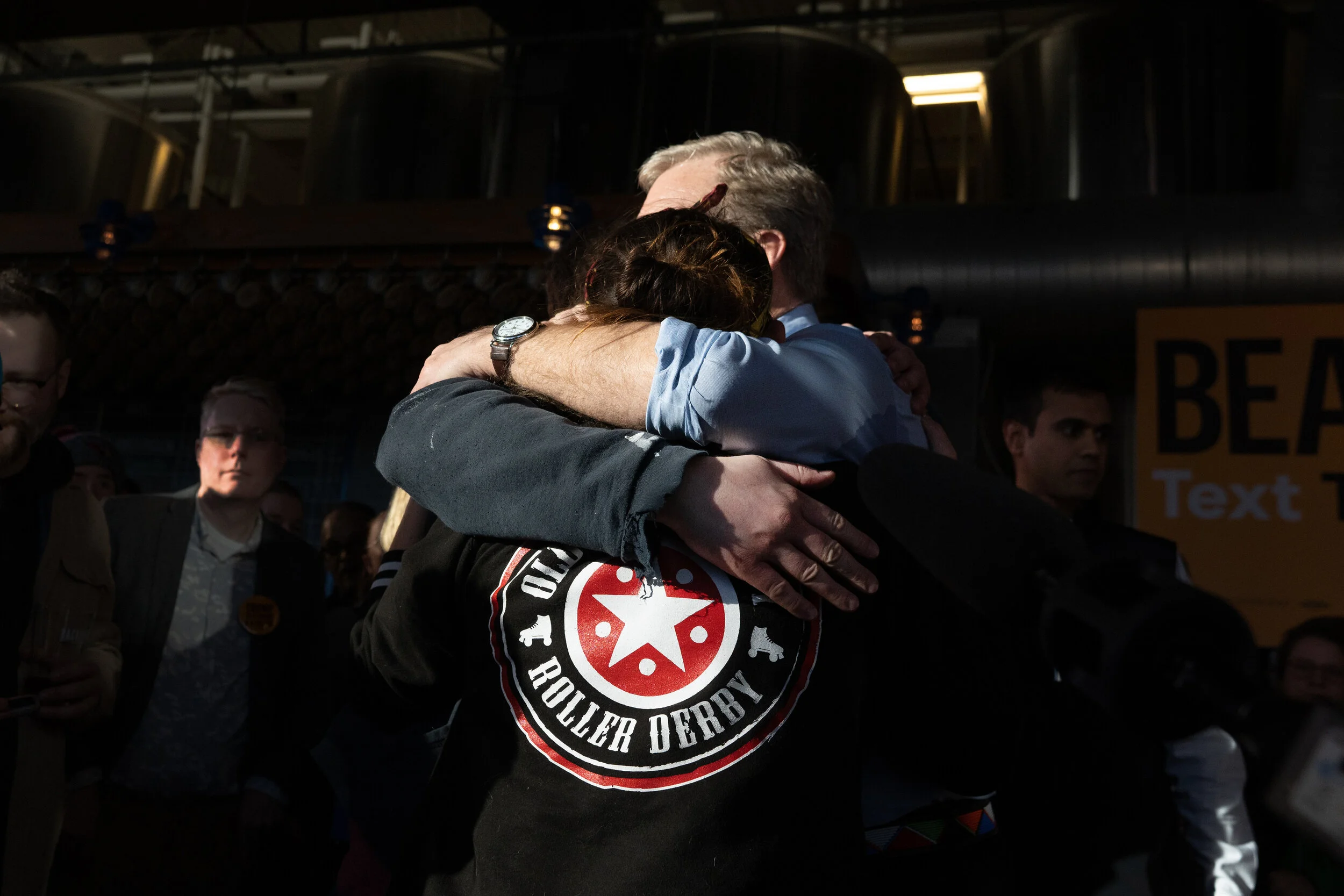 Two people hugging in a dimly lit indoor setting, with interests in the background, one wearing a shirt with a logo that says 'Boulder Derry' and a star emblem. View fullsize